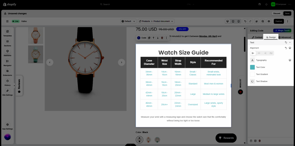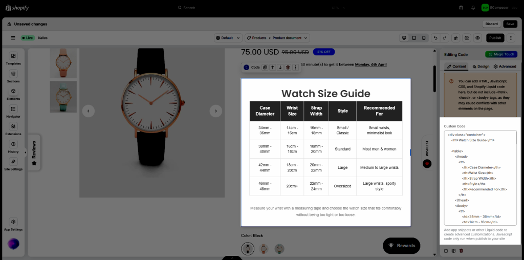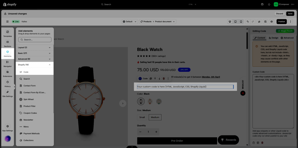 If you want to add custom HTML or CSS code directly to your pagem you can use the Code element in EComposer. This element is designed for cases where you need more flexibility and want to insert custom code into your layout. It is commonly used for embedding external app code, displaying custom tables, or adding special HTML sections that are not available in default elements. Please note that this is an advanced feature and requires basic knowledge of HTML and CSS to use effectively.