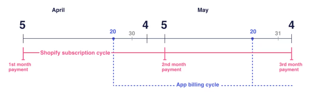 Recurring app charges are billed with the next Shopify 30-day invoice. In the example below, the bill on May 5 includes the app subscription that overlaps from April 20-May 20. The bill on June 4th similarly includes the app subscription from May 20-June 19 (since May has 31 days).