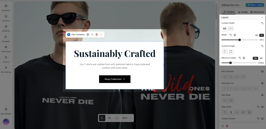 After applying these settings, the Flexbox section will extend fully across the screen.