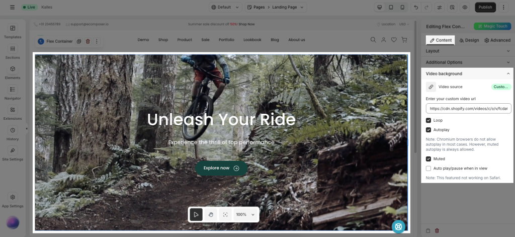 Flexbox Container supports video backgrounds for advanced visual sections.