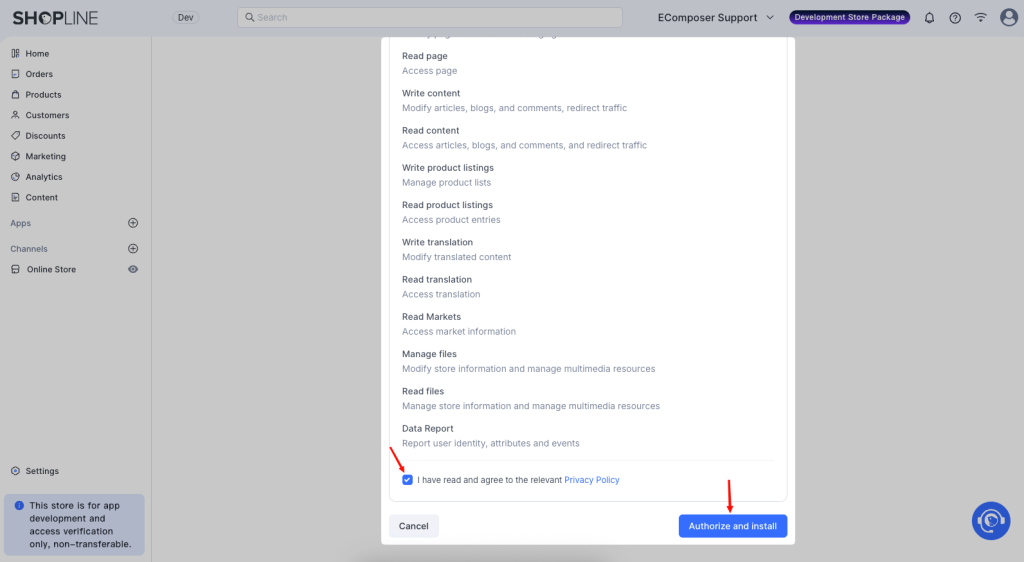 You will be redirected to the installation confirmation page inside SHOPLINE. Tick the “I have read and agree to the relevant Privacy Policy” and click the “Authorize and install” button to complete the process.