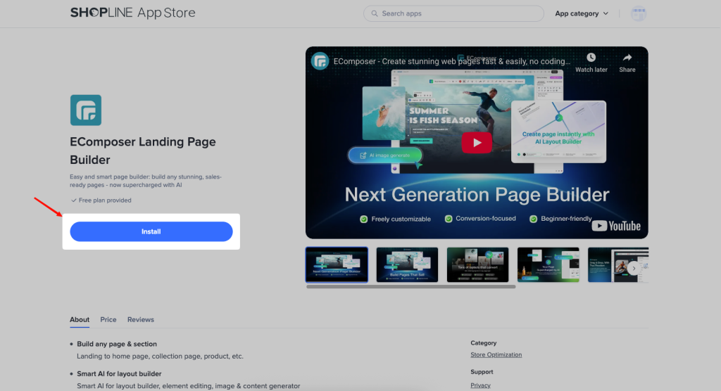 To install EComposer on SHOPLINE, find the EComposer app on the SHOPLINE App Store -> Click the Install button.
