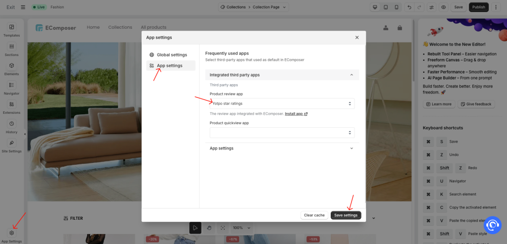 Step 1: Select Yotpo in the App Settings. Before enabling ratings, you need to connect Yotpo as your review provider. Go to EComposer → App Settings. Find the Product Reviews Integration section and select Yotpo as the review app.