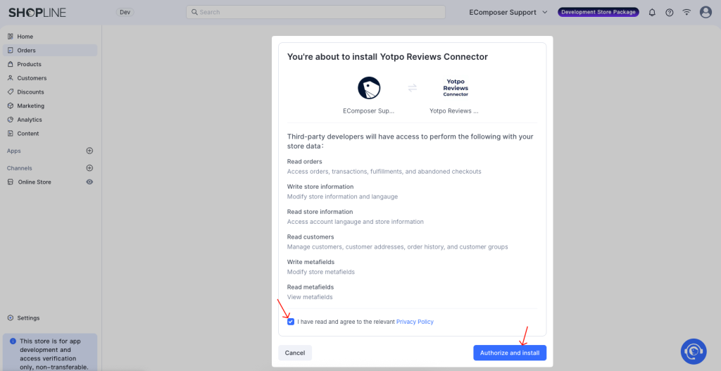 Then tick the “I have read and agree to the relevant Privacy Policy” checkbox and click the “Authorize and install” button to install the app to your store.