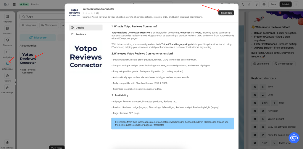 Next, open the EComposer app and go to your page to install the extension. Under the Extensions tab, find the Yotpo extension and click the Install now button to install it.