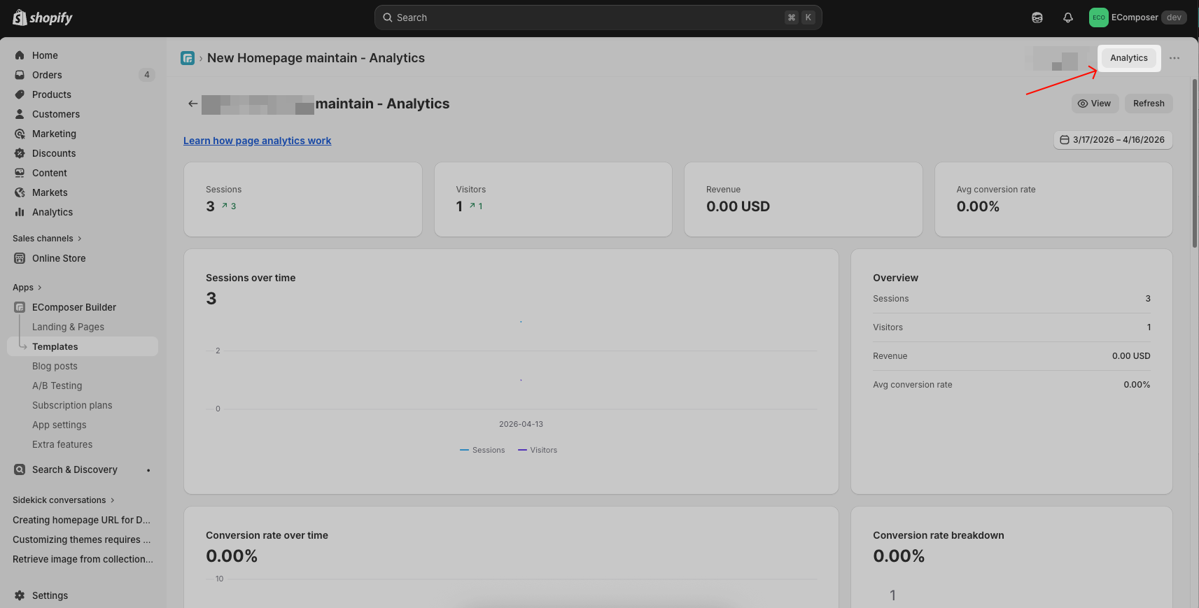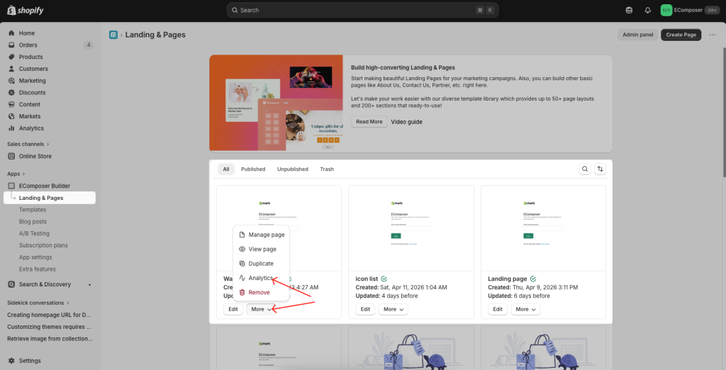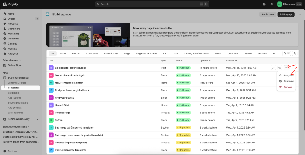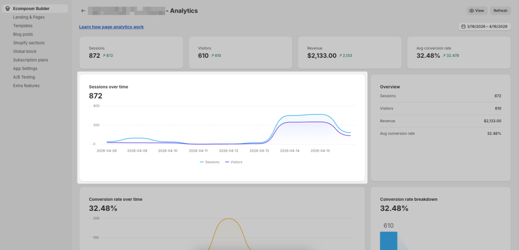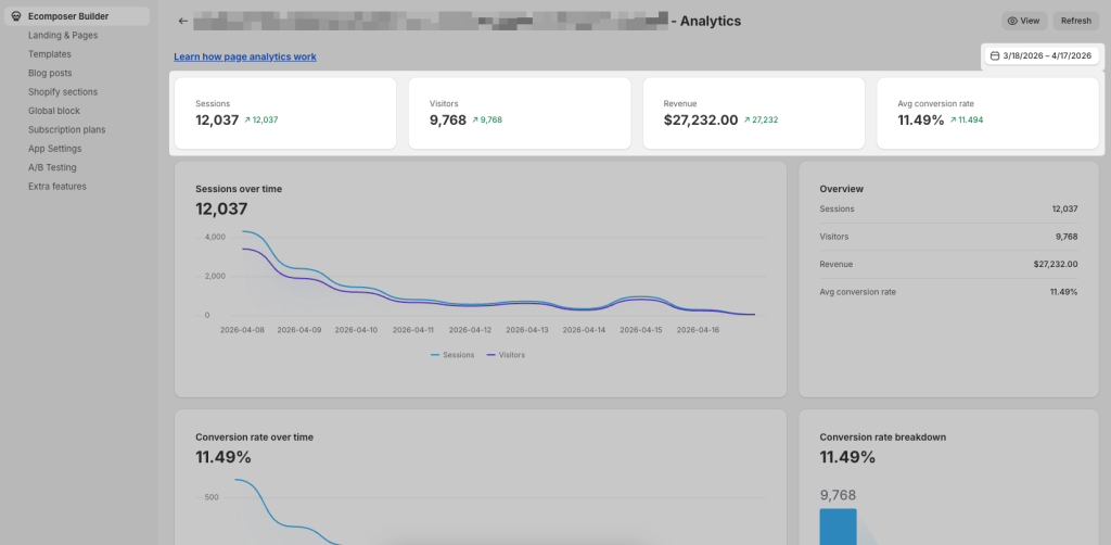 The app now starts tracking your page performance. You can view all reported metrics of any EComposer page by clicking on the “Analytics” button from any page.Â