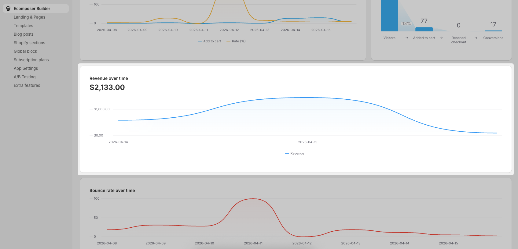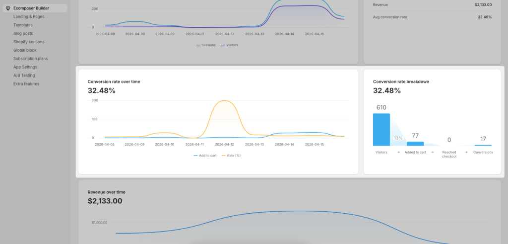 EComposer’s Page Analytics feature is an excellent tool for tracking the performance of your web pages. By analyzing key metrics like Sessions, Visitors, Add-to-Cart, Page Revenue, and Bounce Rate, you can gain valuable insights into user behavior and optimize your pages for better conversions. Whether you’re new to eCommerce or a seasoned pro, EComposer’s Page Analytics feature can help you take your website to the next level.