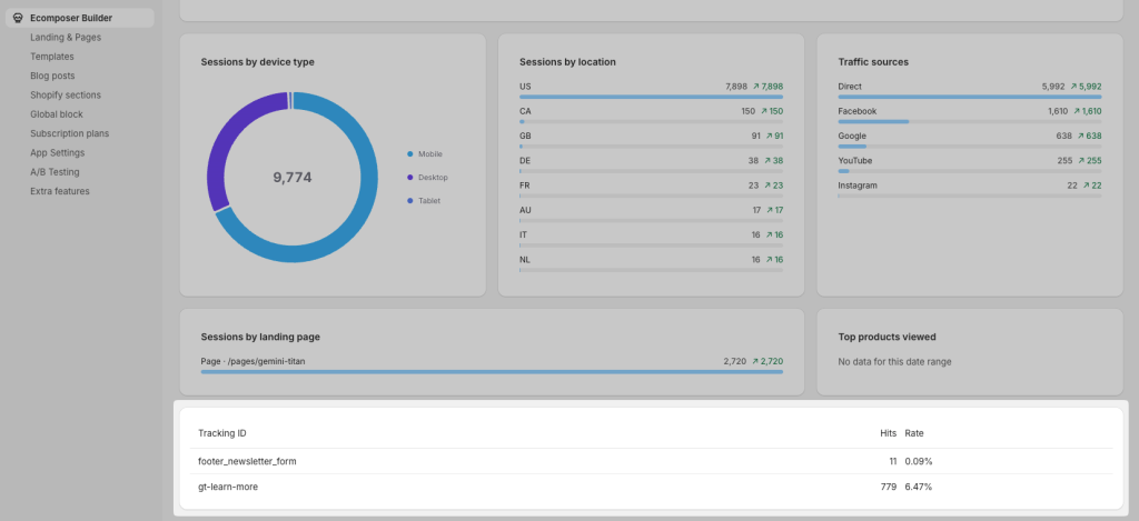 Go to App Settings > Analytics > Enable to start tracking the visitors engagement on your EComposer pages.
