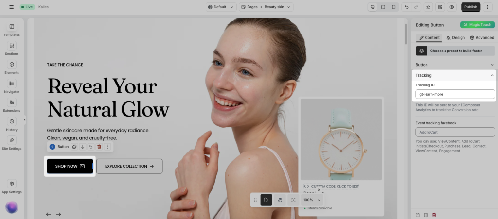 To track the conversion rate of a button on your page, from the EComposer editor, click on that button, navigate the button settings, and enter the Tracking ID here: