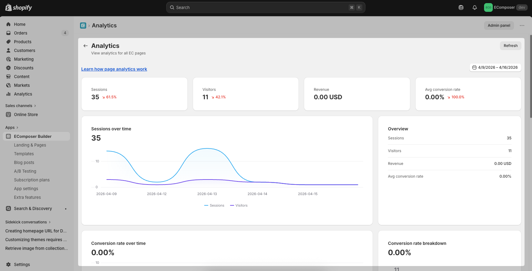 EComposer’s Page Analytics feature reports on five key metrics: Sessions, Visitors, Revenue, and Avg Conversion Rate.