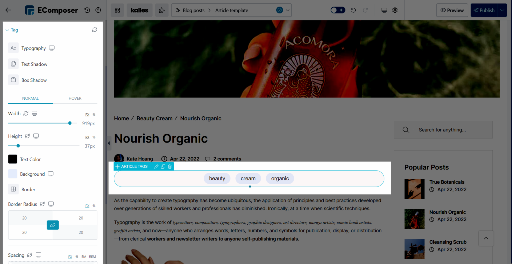 You can adjust the style for the tag with these options: Typography, Text Shadow, Box Shadow, Width, Height, Text Color, Background, Border, Border Radius, and Spacing.
