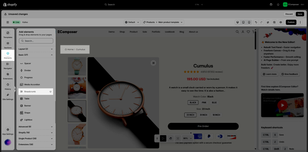 This element allows you to add breadcrumbs to a pre-built layout. You can drag and drop this element to any position on your page. However, it is often placed on the top of the page to help customers return to the homepage faster.