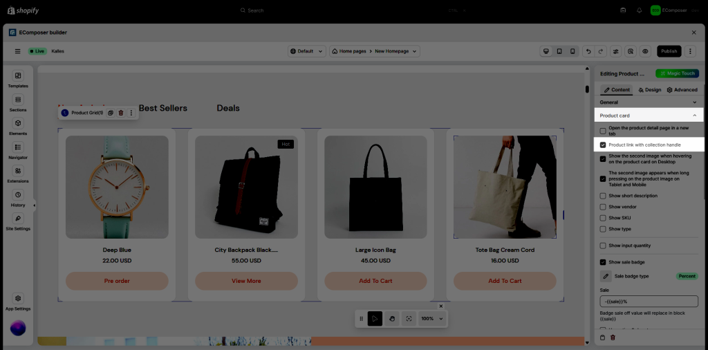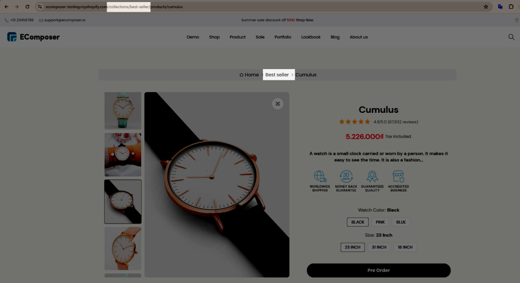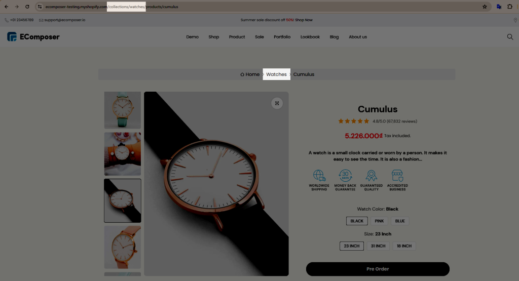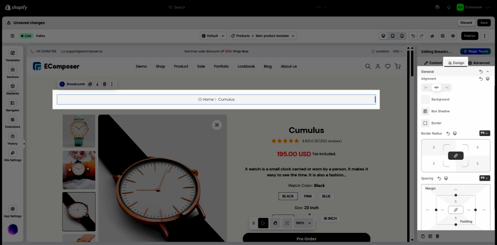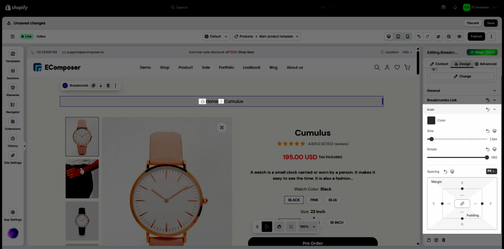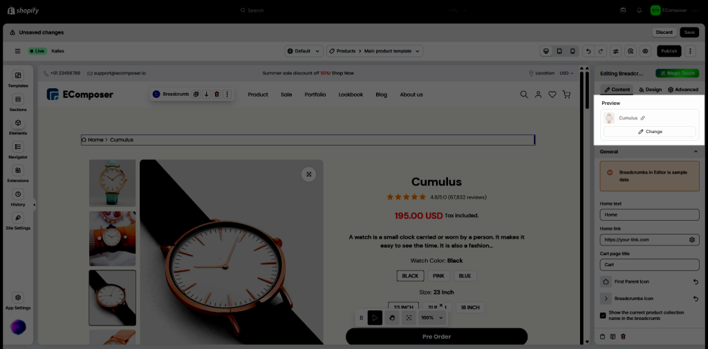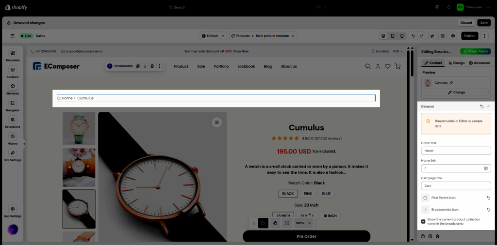- Show the current product’s collection name in the breadcrumb: This option is only available on the Product template, it allows you to show/hide the current product’s collection name in the breadcrumb.