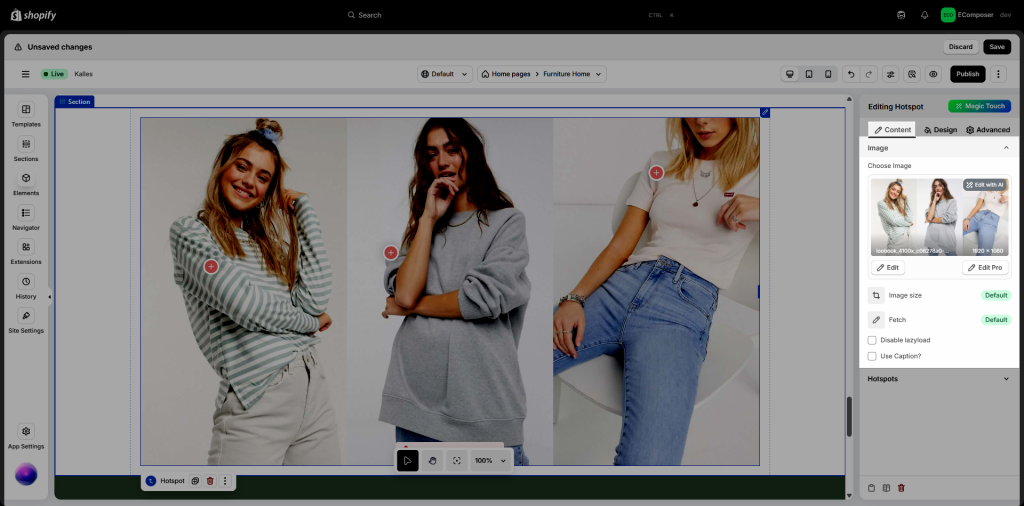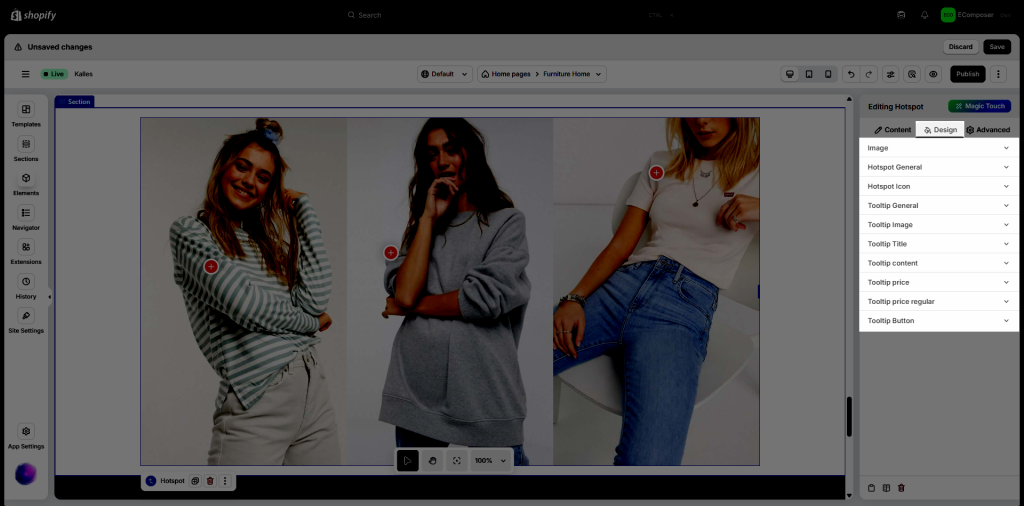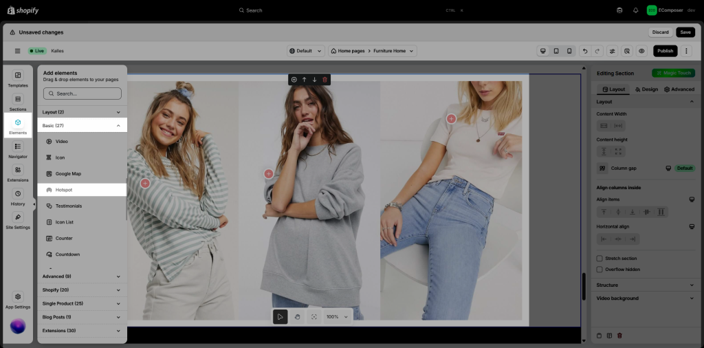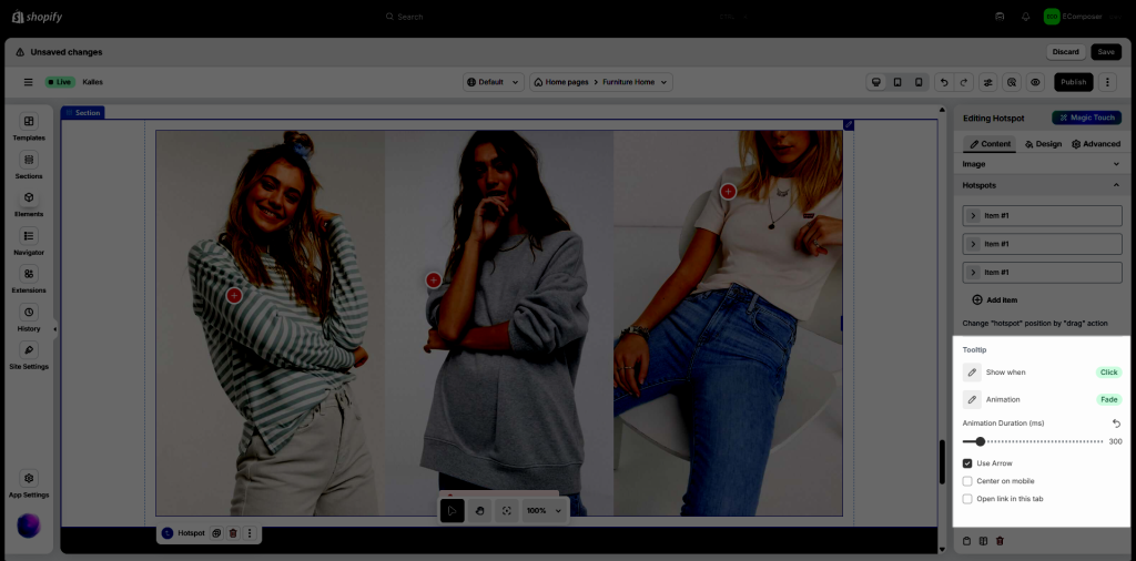 The purpose for us using the Image Hotspots element and add interactive areas on top of your images which is useful for cross-selling products. You can take photos of multiple items at once and link to each one. This approach will also encourage your users to experiment with different combinations of your products. You can send across a message to your customer like how to wear a jacket with a skirt and shoes, for example.