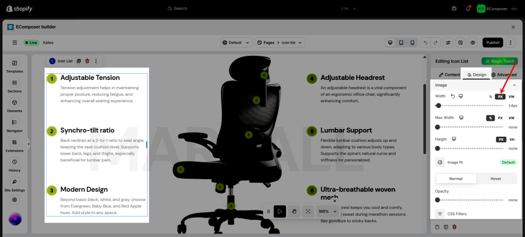 - Width: Set the image width, allowing different values for each device. To avoid spacing issues between the image and text, you should specify the width in pixels (px).