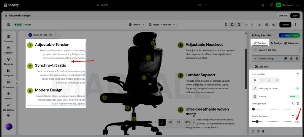 - Spacing: Set margin or padding value for the icon list (available for desktop, tablet, and mobile devices).
