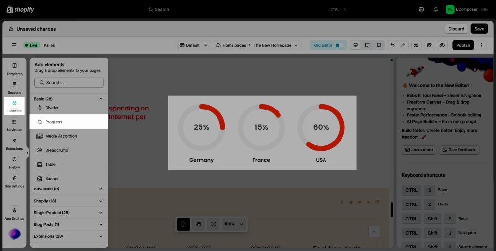 Drag and drop the Progres element from the Basic tab to any area in the editor where you wish to add it. Take a look at the screenshot below: