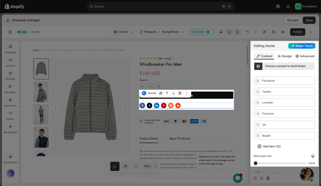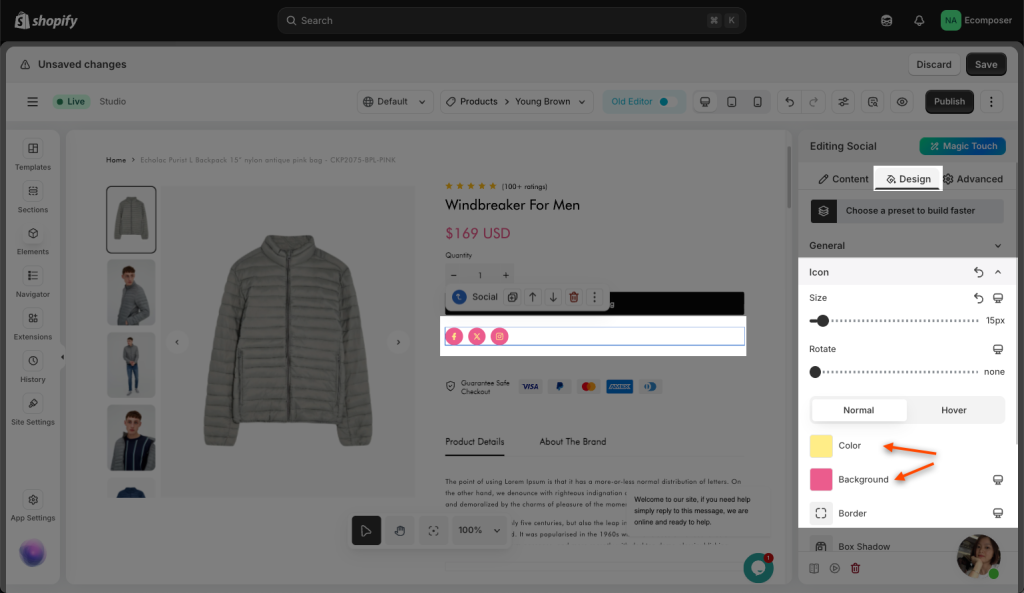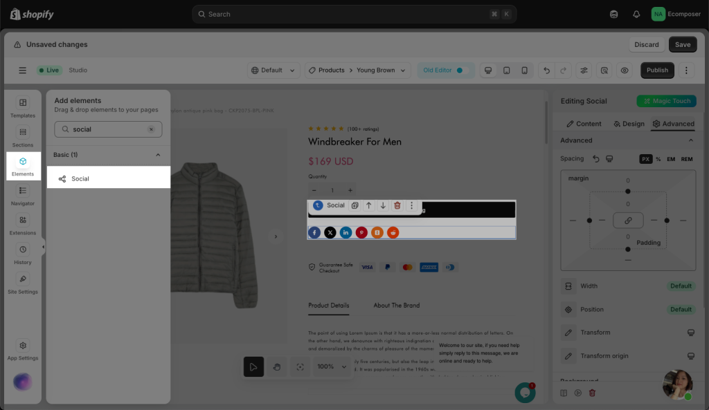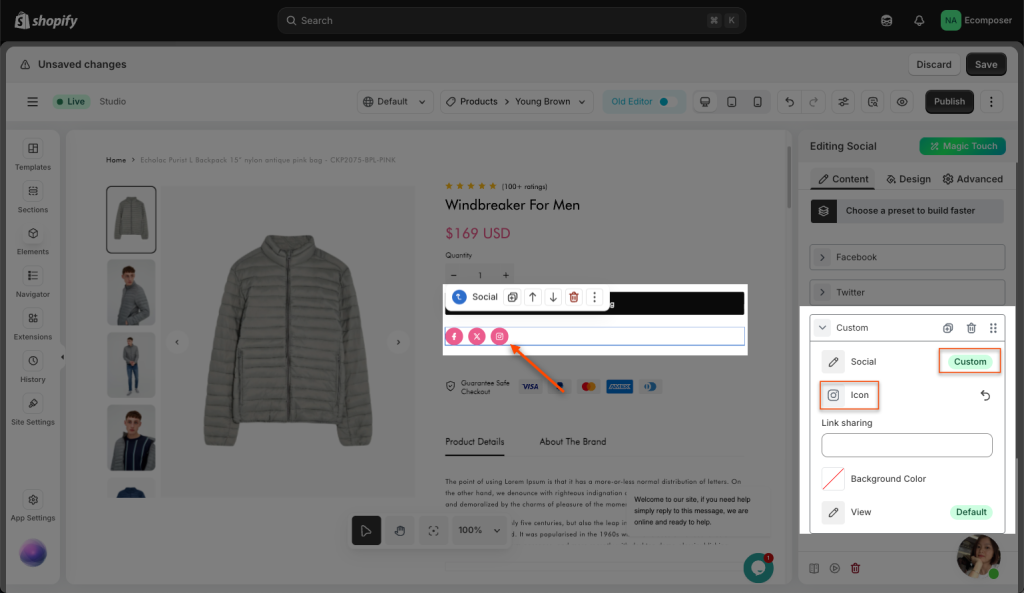 The Social element is represented by interactive digital channels that facilitate the creation and sharing of information, ideas, interests, and other forms of expression through virtual networks. For instance, you can see Facebook, Instagram, Twitter, and even your store’s email address on your retail website. This entails allowing your customers to click on it and be lifted straight to your shop. Also, this feature will provide your customers with additional information about your shop. Follow the steps outlined below with the EComposer App.