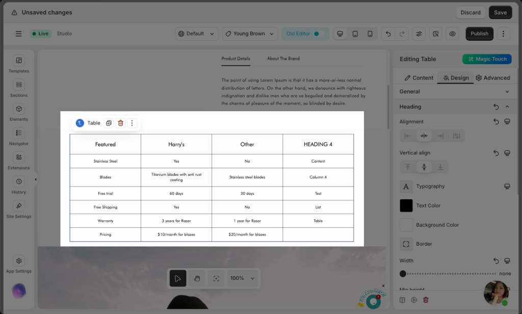 Note: The Table element only supports plain text content. You cannot add custom elements such as icons, images, links, or buttons inside table cells.
