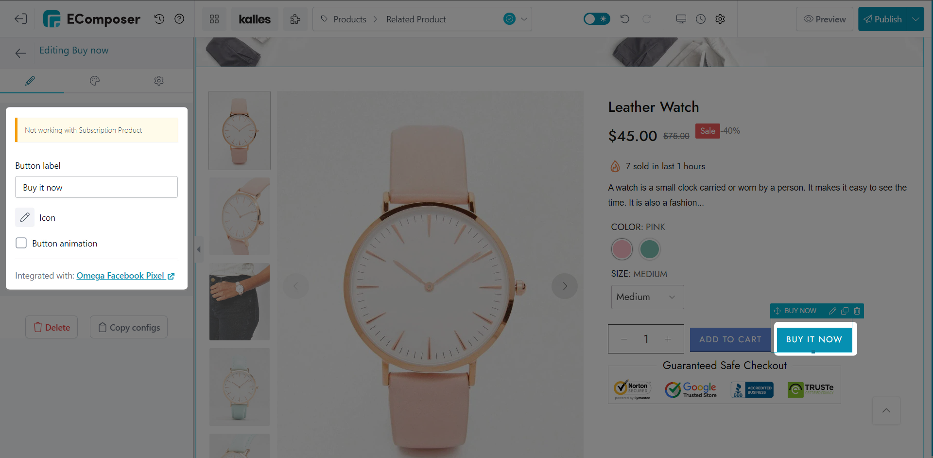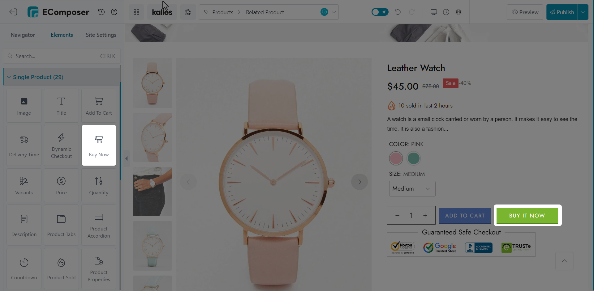 From the Single Product tab, you can drag and drop the Buy Now element to anywhere that you want it to stay.