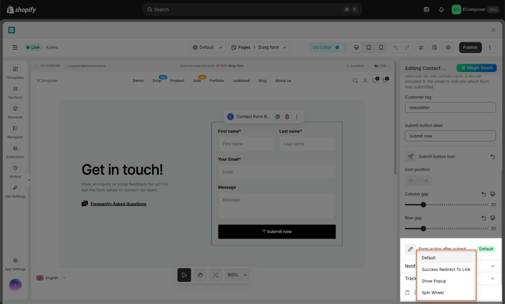 In the default Shopify form, submission data is sent to the Shopify Admin under the “Customers” section. However, with the new contact form, submission data is sent directly to the App Admin, allowing you to monitor form performance right within the app. Additionally, the new form supports integration with Pop-up and Spin Wheel functionality.