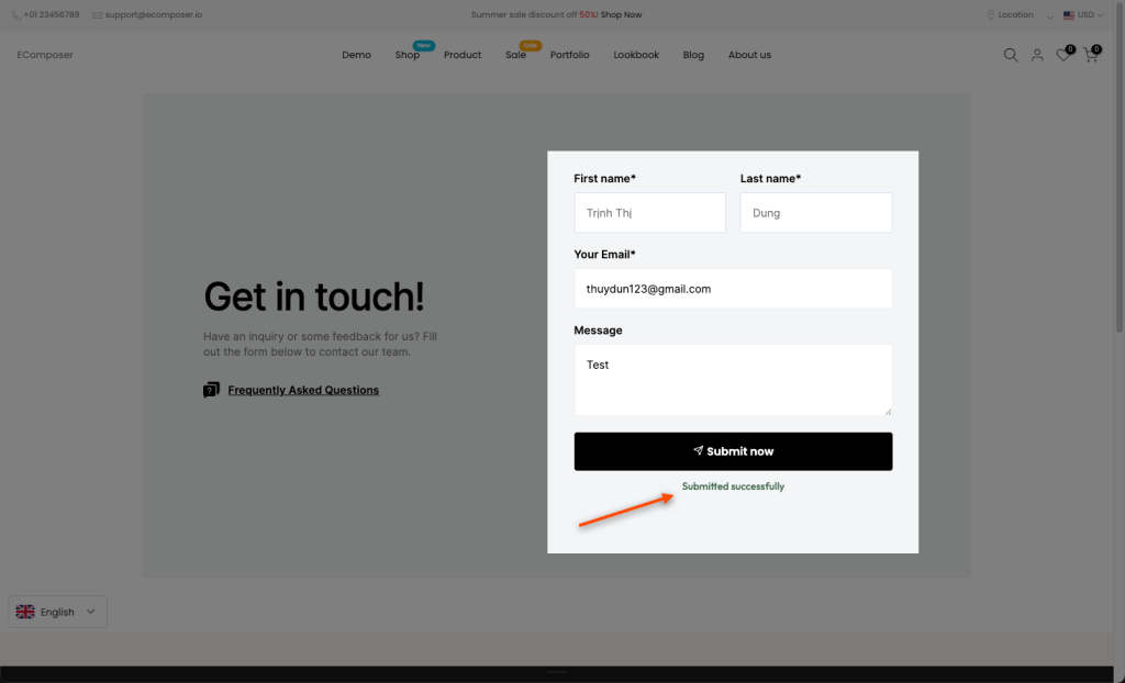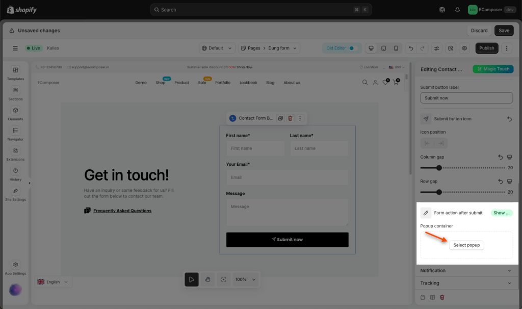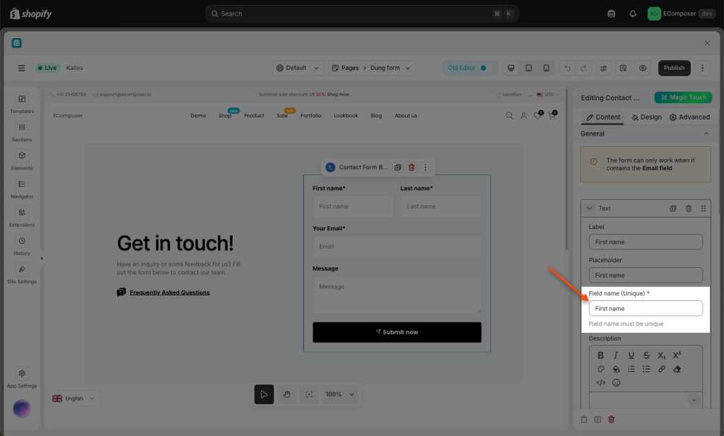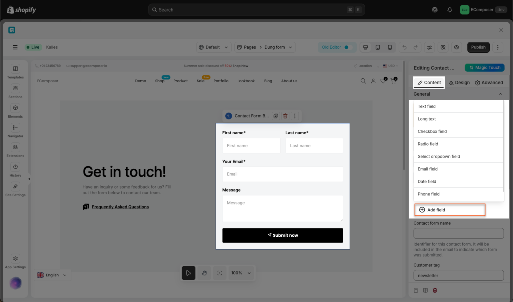 The Contact Form by EComposer provides flexible input types to collect customer information effectively. You can freely add, remove, or customize each field based on your form’s purpose.