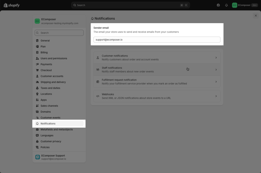 In case you want to change the email address, please go to Shopify admin => Settings => Notifications => Sender email.