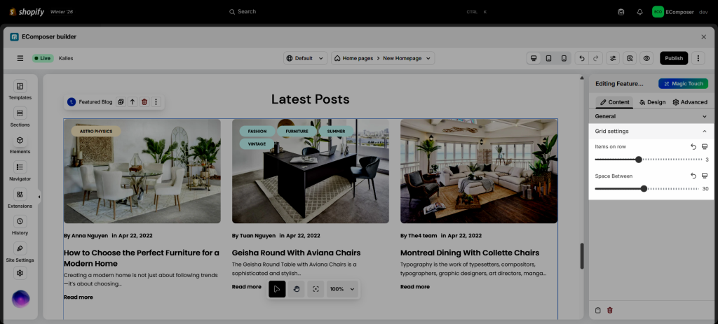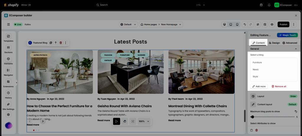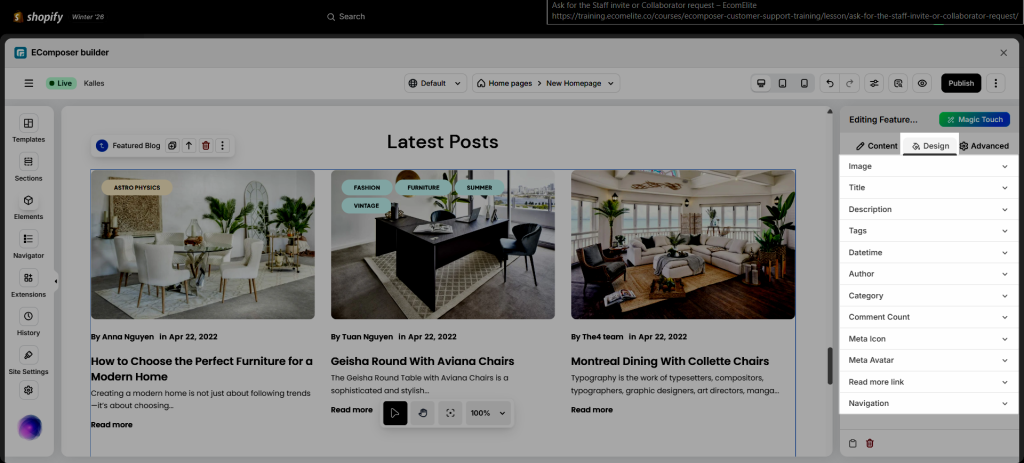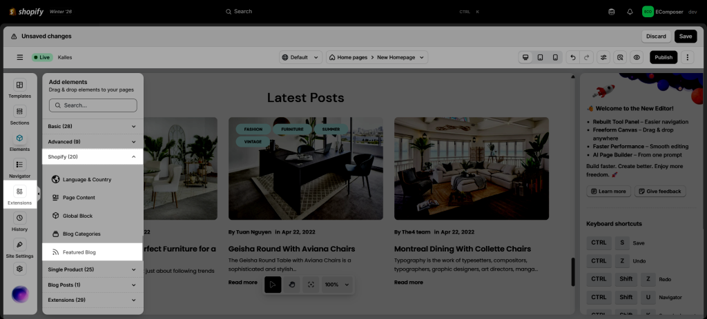 - Click into Elements –> Shopify –> Featured Blog