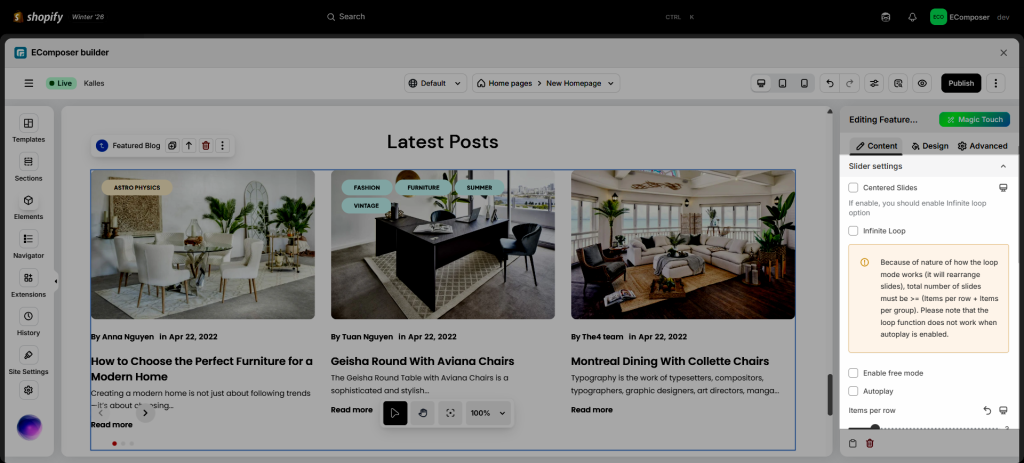 - You can also edit the Speed, Items per row, Column gap, and Row gap of the slide, let’s make it look fantastic depending on your setting.