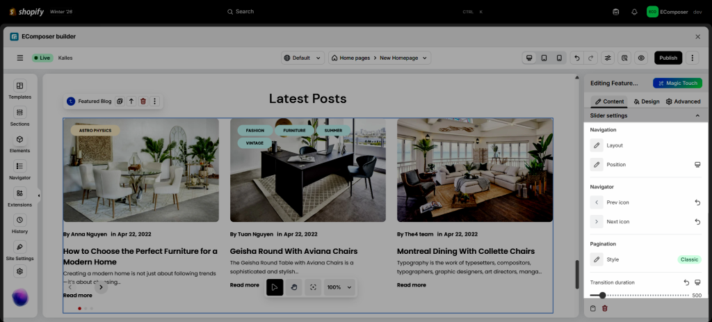- This section also allows you to change the Navigation layout and Prev-Next icon to be the other style, including changing the position of that, or maybe changing the last one, which is Transition duration, to make it change the other page at a slower or faster speed.