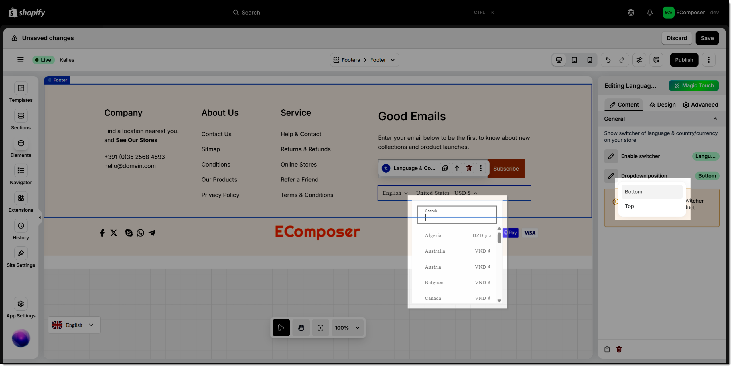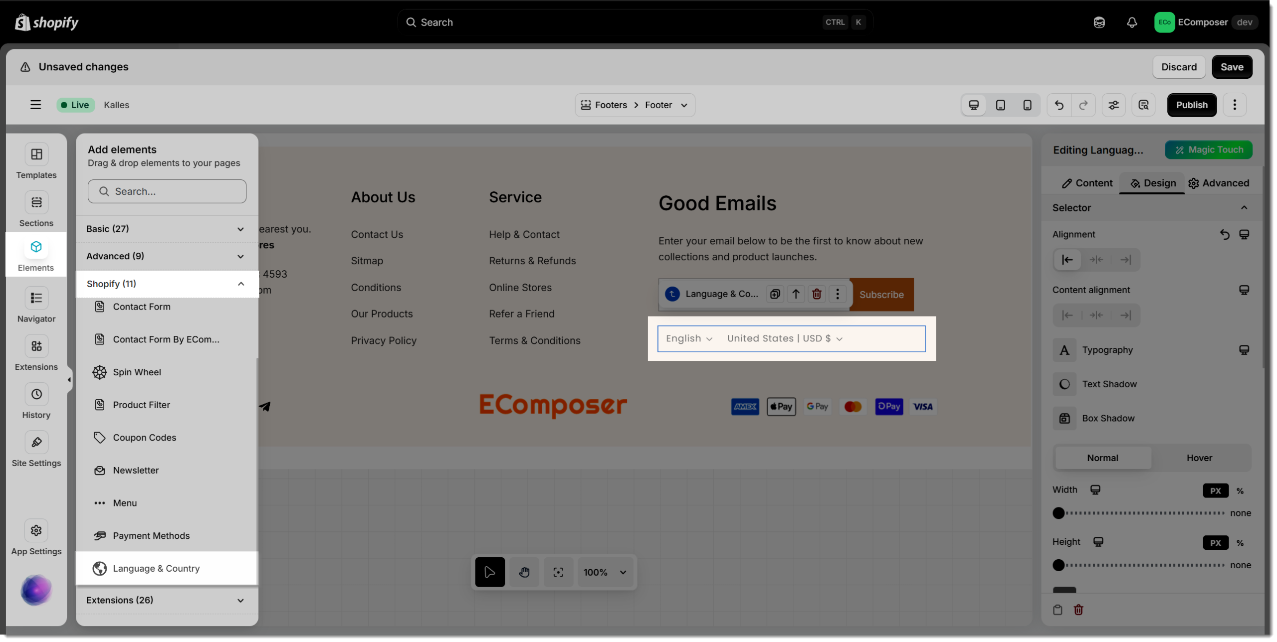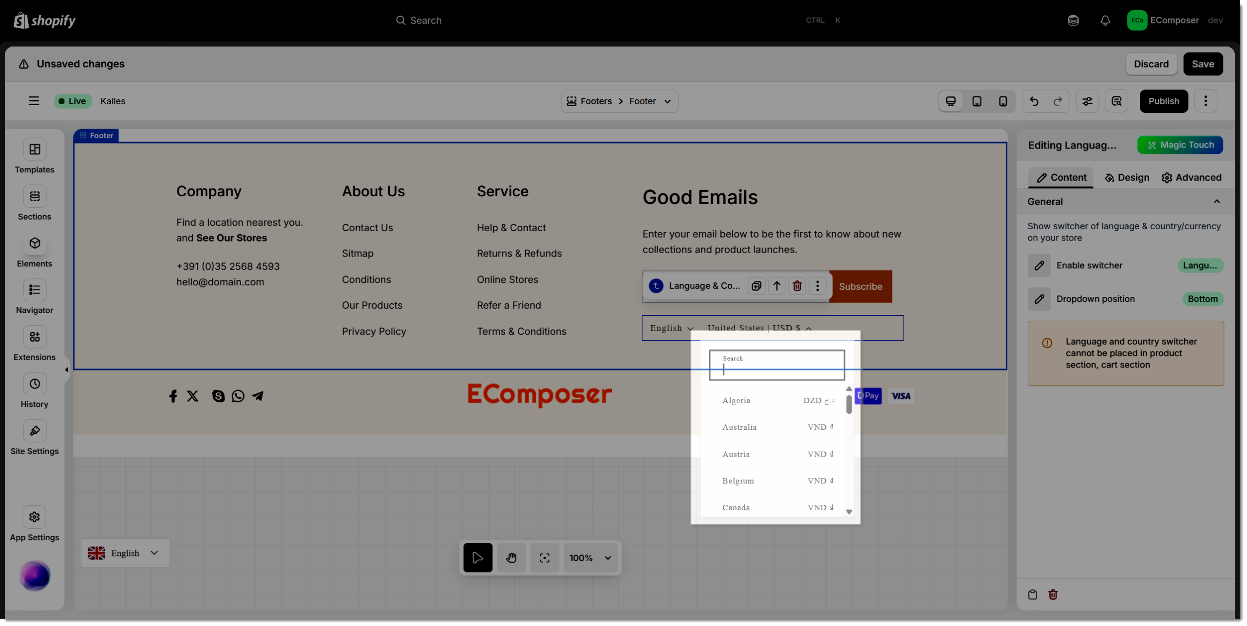 The Language & Country element in EComposer provides an effortless way to deliver a localized shopping experience for global customers. It enables visitors to easily switch between different languages and currencies, ensuring a personalized and user-friendly browsing journey tailored to their region.