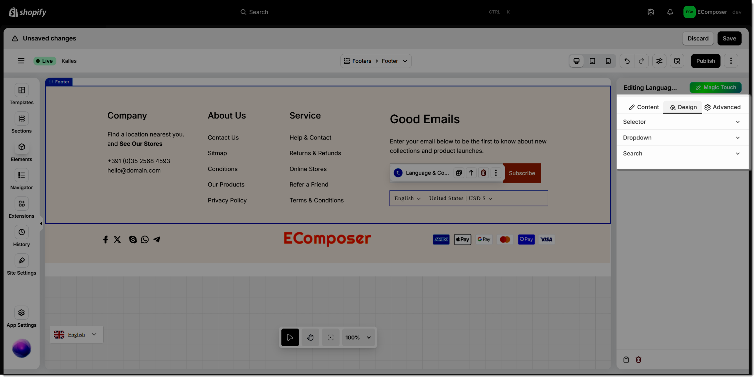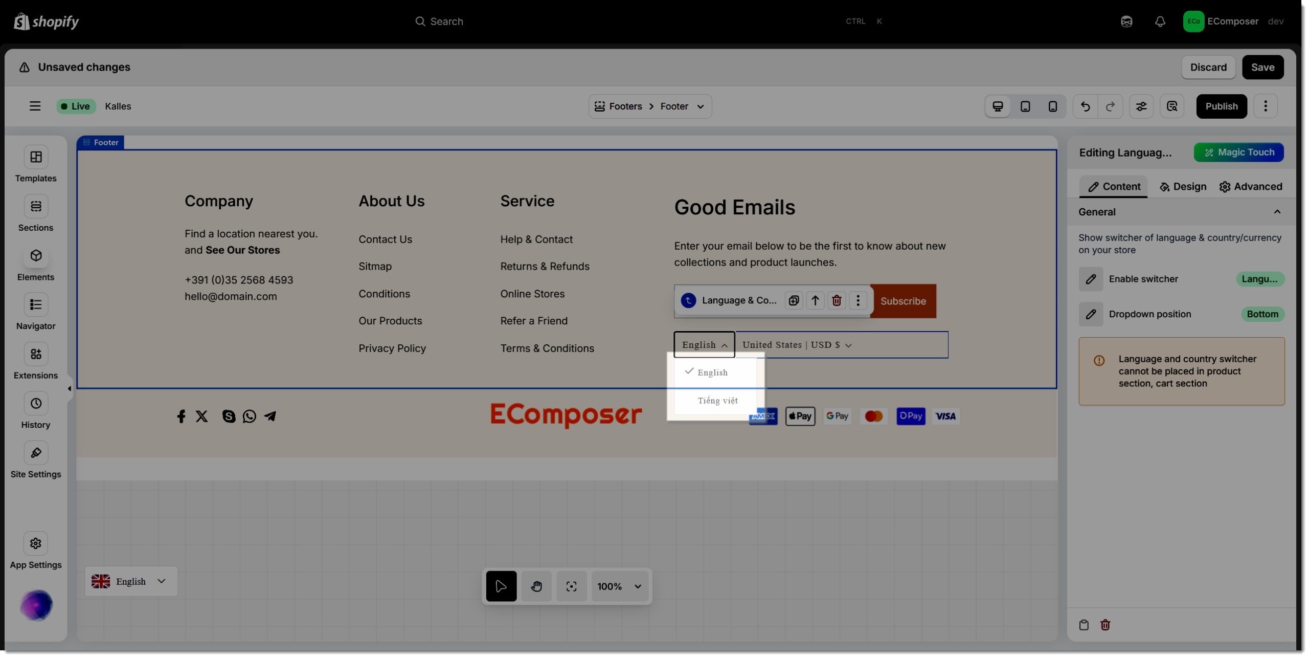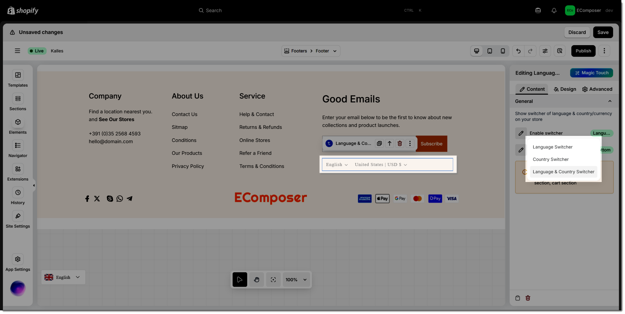 The Language & Country element in EComposer provides an effortless way to deliver a localized shopping experience for global customers. It enables visitors to easily switch between different languages and currencies, ensuring a personalized and user-friendly browsing journey tailored to their region.