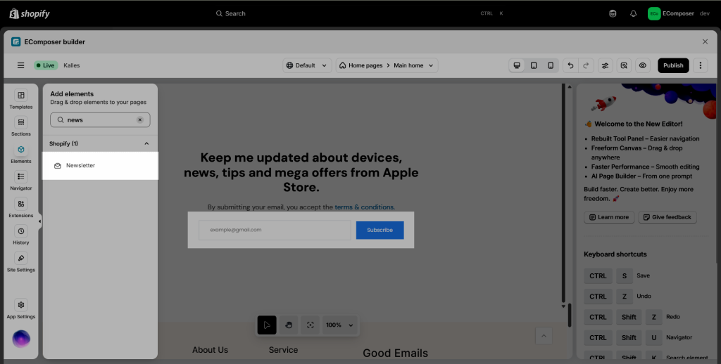 From the left sidebar (Elements tab) > Drag and drop the Newsletter element to any position of the page. This element can be used on any page type.