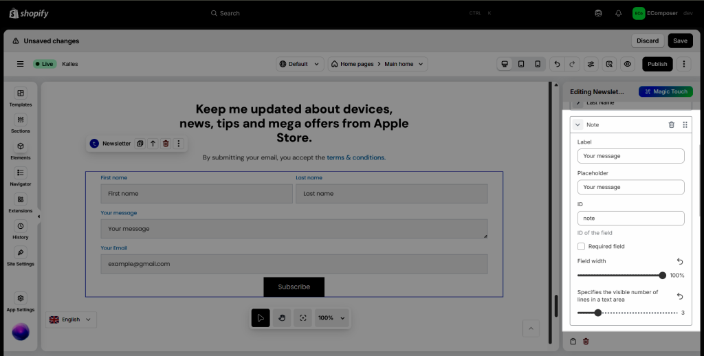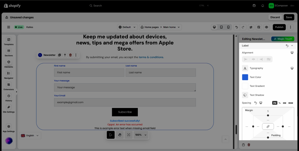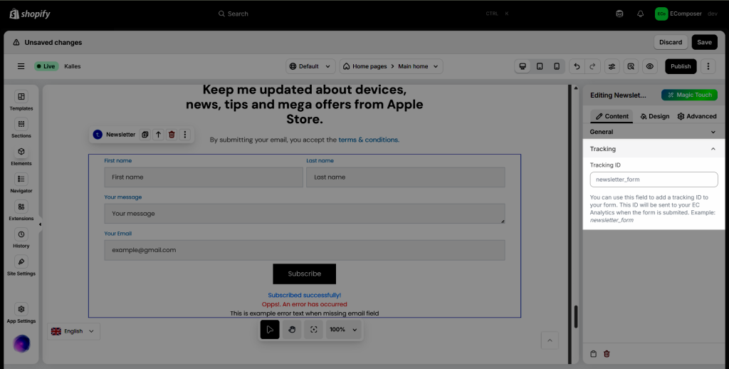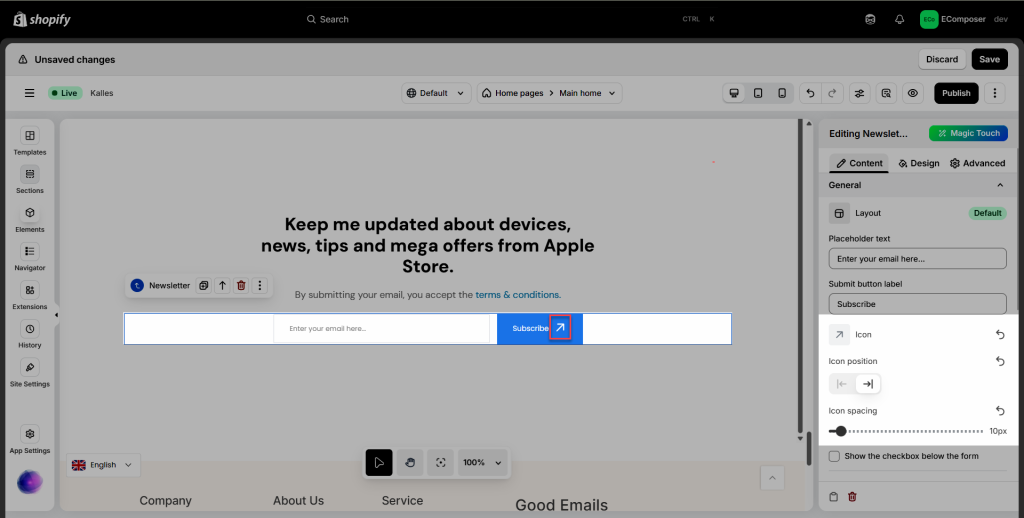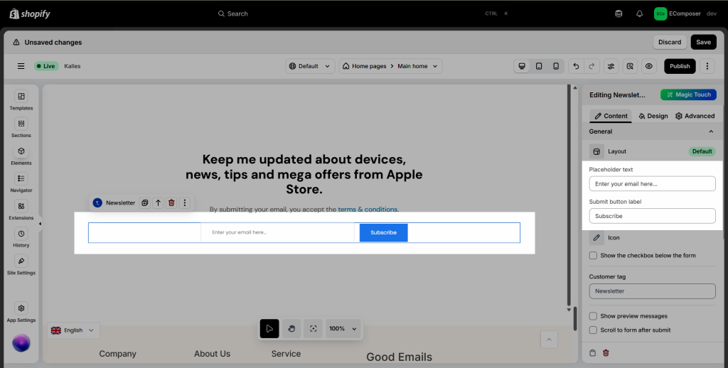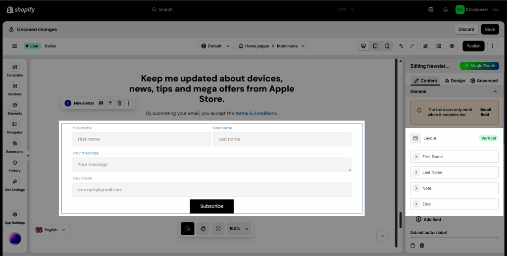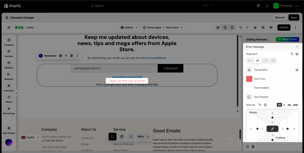 Please don’t put the Newsletter element in the same section as the Product elements.