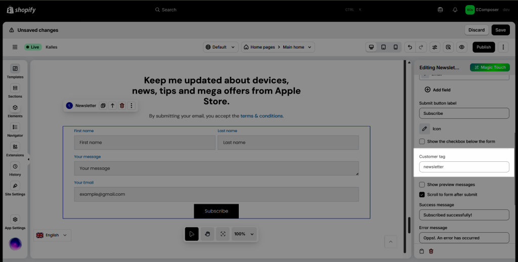 - Customer tag: Using custom tag(s) helps you track newsletter subscribers and whether they are signing up from the newsletter section, footer, or pop-up newsletter forms. This can also be used to segment customers making it easier to create marketing campaigns or send emails.