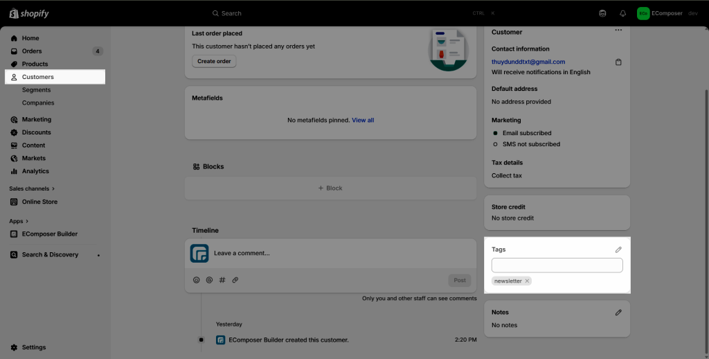 After submitting the email, the tag will be sent to the Customers in Shopify Dashboard.