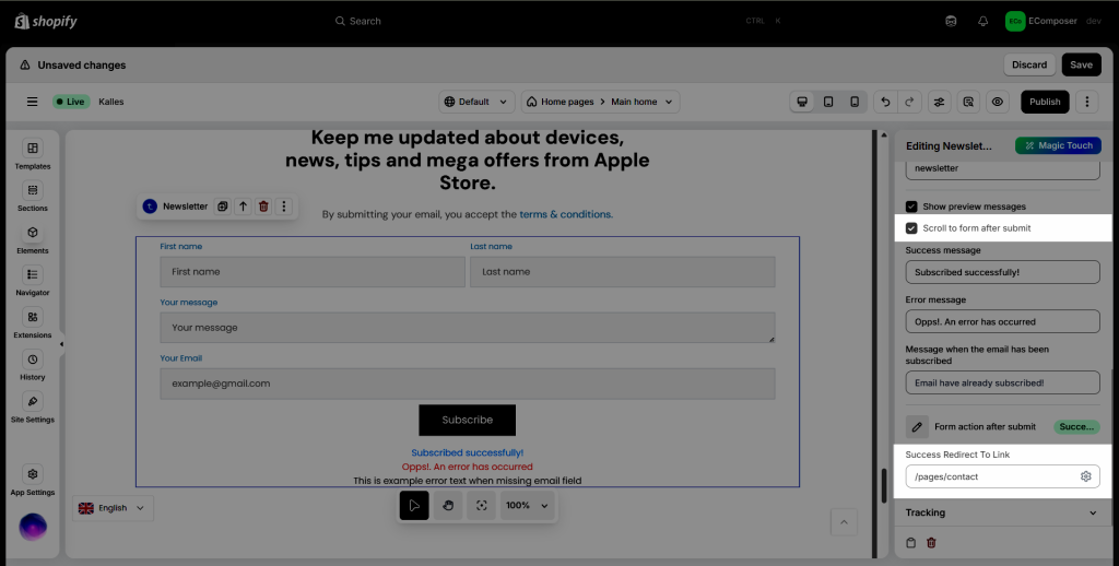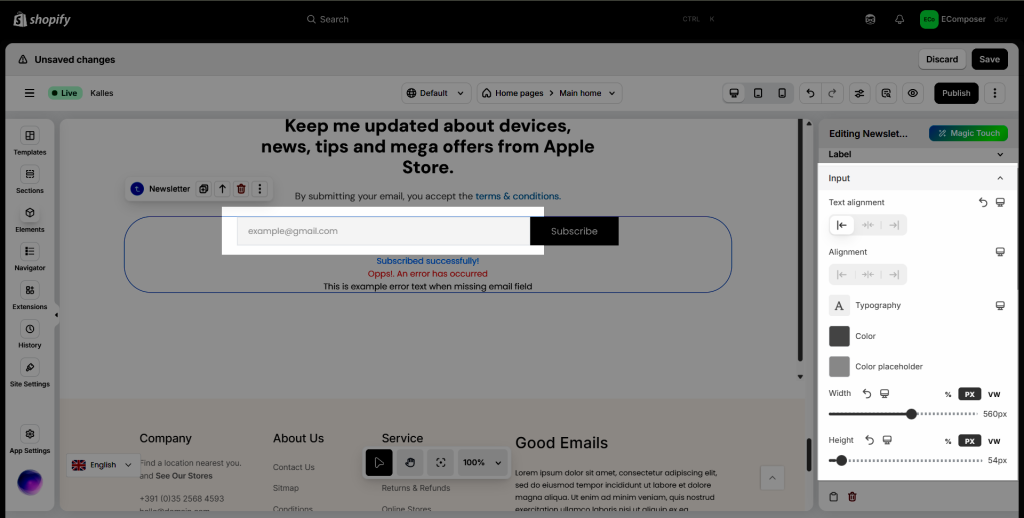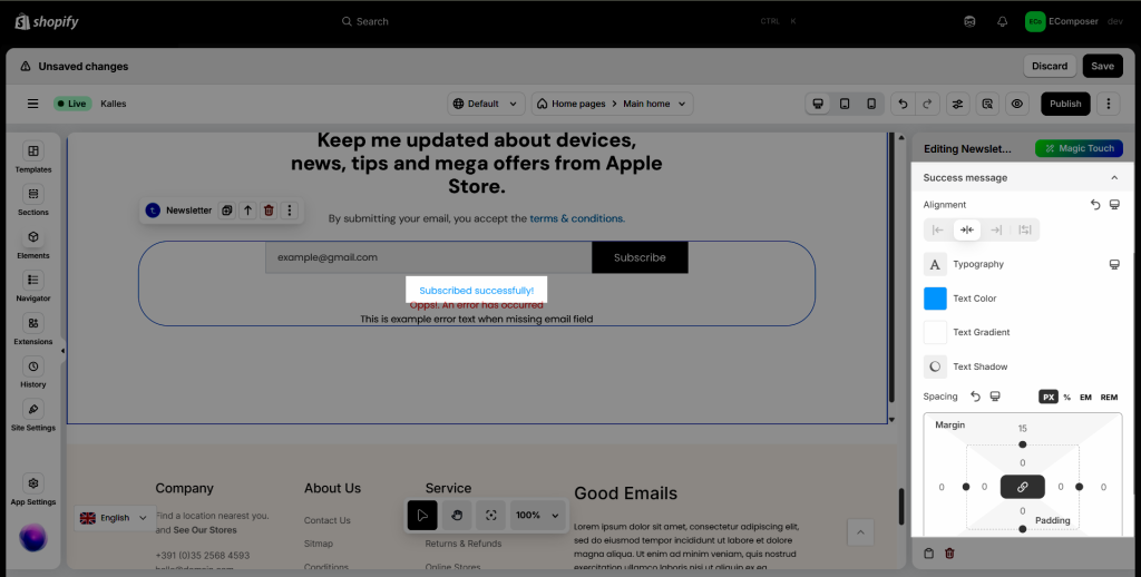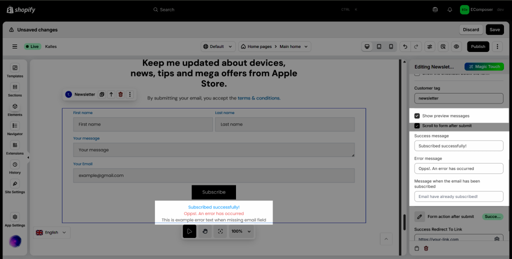 - Message when the email has been subscribed: Add the content when the email has been subscribed here.