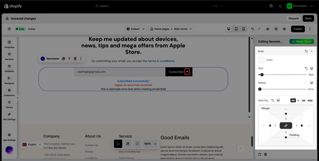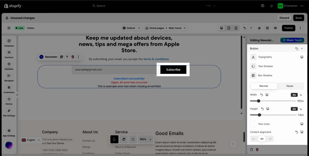 - Alignment: Allow you to align the Newsletter element. You can choose Align Left, Align Right, or Align Center.