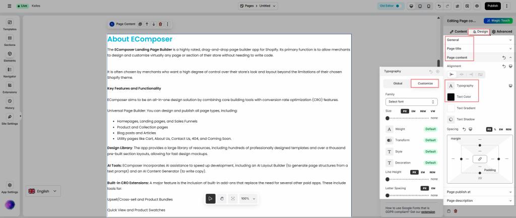 For example, if you have an Accordion or Tab element and want to include long text in each tab, you can create that content as a Shopify landing page (from your Shopify admin → Online Store → Pages), and then use the Page Content element to display that page’s content inside EComposer.