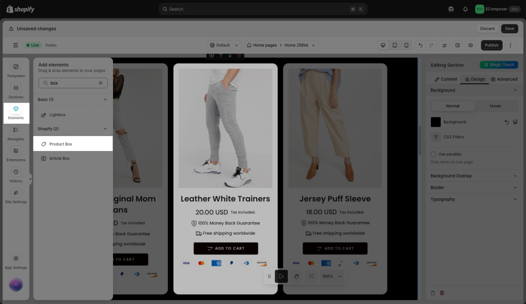 Now you can unleash your creativity to modify the content of the custom grid element with this extremely useful element. Access the Product Box element easily within the Element sidebar. For example, you can create a Product grid section with 3-4 different products.
