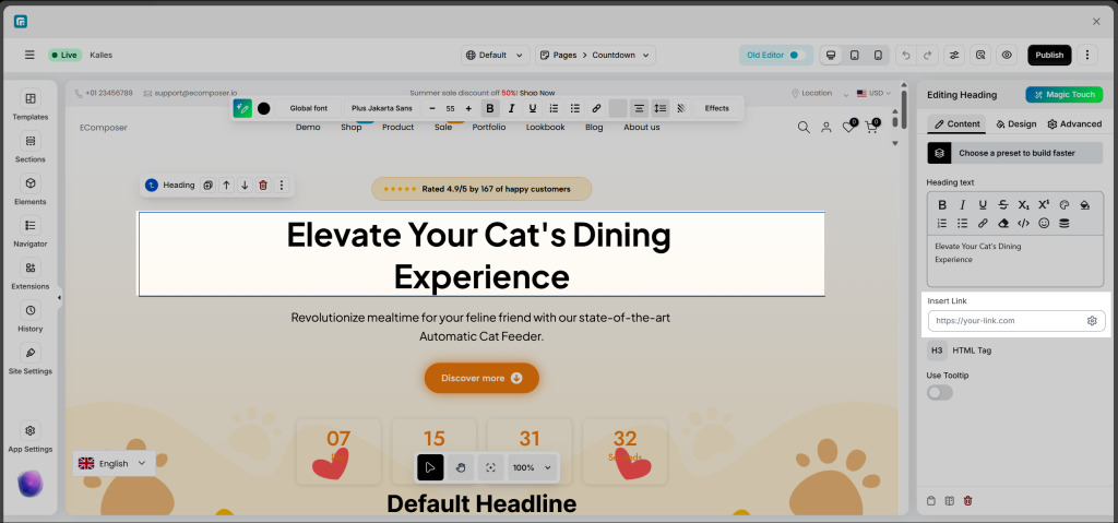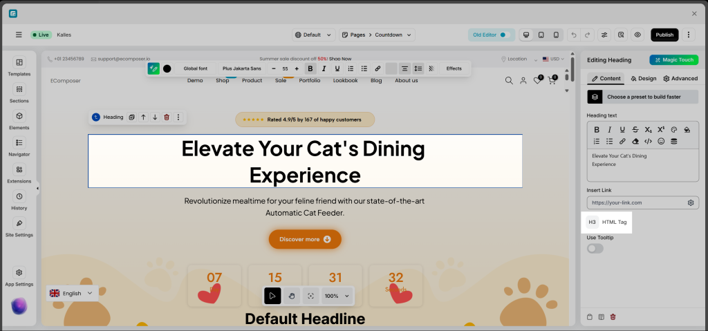 In the Design tab of the Heading element, you can customize the text appearance to match your store’s branding or create visual emphasis for your titles.