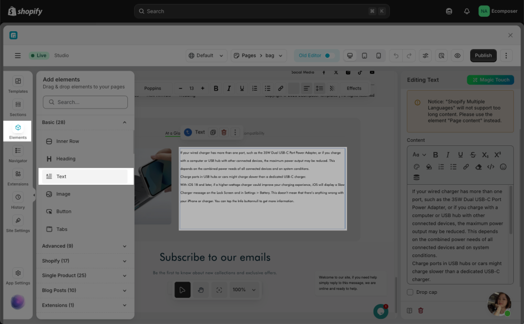 The Text Editor element allows you to enter the rich text you wish to be displayed. From the Basic tab, you can drag and drop the Text element to anywhere that you want to add content.