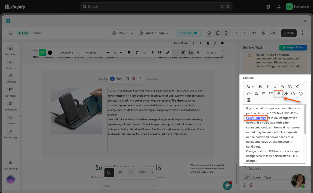 To use ChatGPT with EComposer, users need to access the AI Content Generator function within the app while they edit any text element. They can then enter a prompt or keyword related to their brand, and ChatGPT will generate a professional, well-written response in seconds. The generated content can be easily edited and applied immediately to the elements.