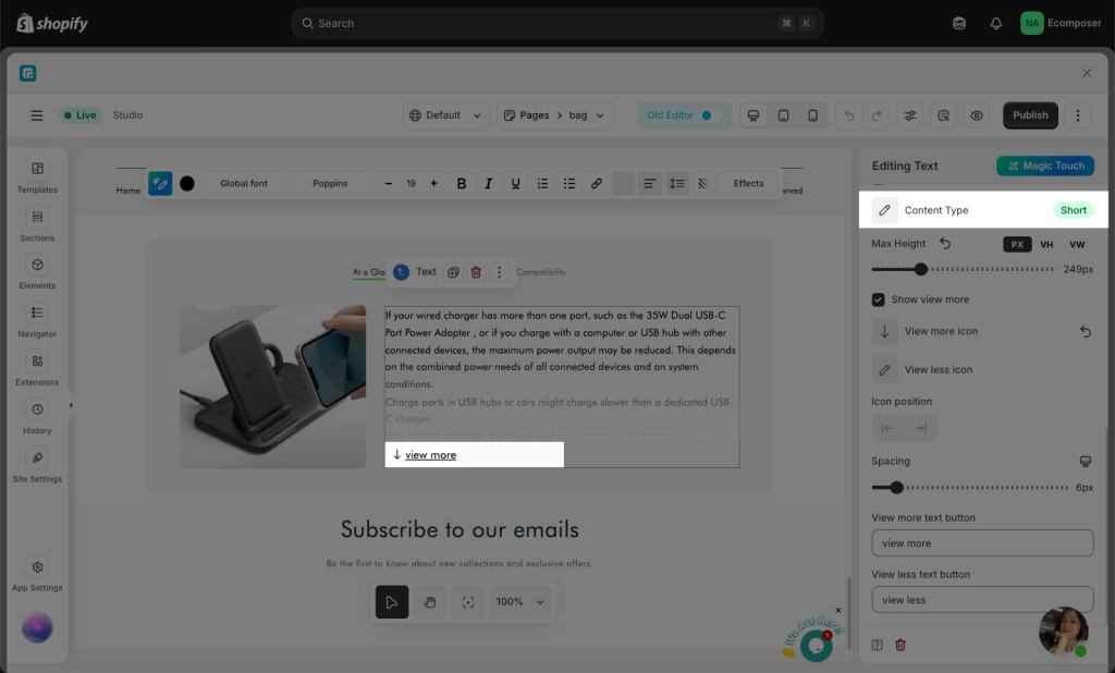 - Content type: You can choose to show full content or short. If you decide to show short, you can show the View More and View Less buttons, including the setting for the content as Max height, Show View More button, etc.