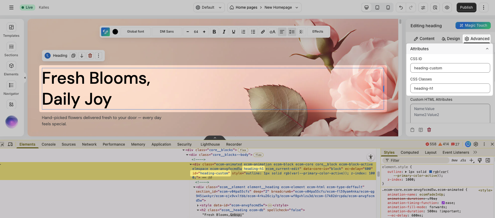 HTML and CSS box: If you want to add your own coding for individual elements, use the Additional CSS and HTML box here.