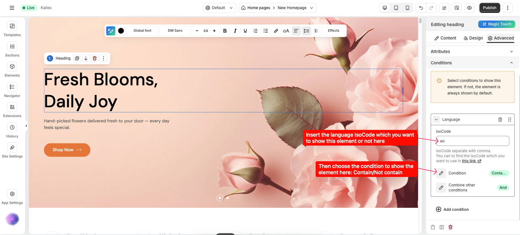 product.metafields.custom.img.valueWith 5 conditions about User Tags, Language, Product Type, Product Vendor, and Current Page, you can choose condition Contains or Not contain