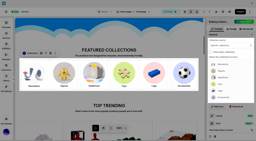 Step 3: Assign the template to the collection, then preview to see the sub-collections displayed.