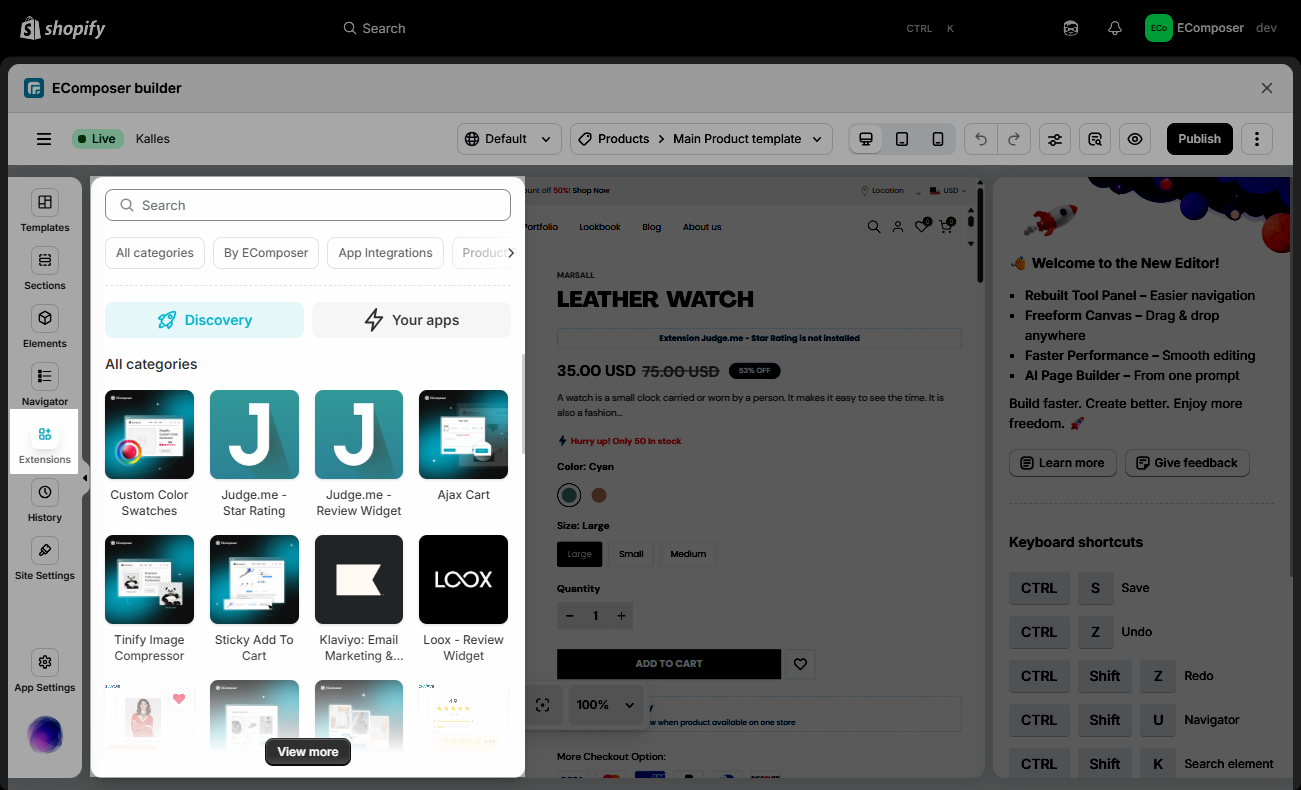 To open the Extension popup: From the left sidebar, go to Extensions → search for the extension name and click to install, or click View more to browse all available extensions in the app.