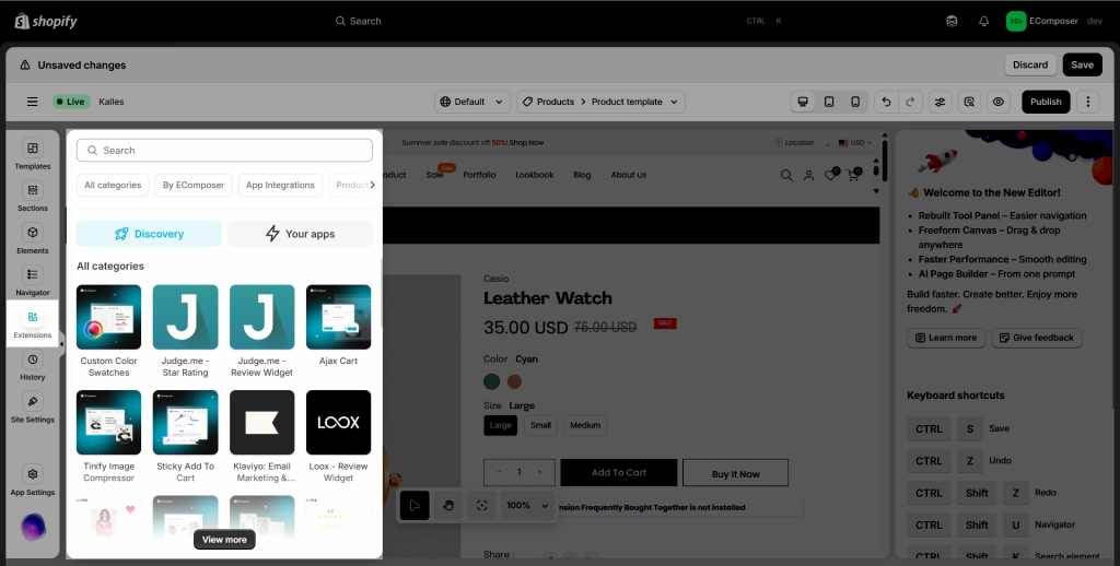 To open the Extension popup: From the left sidebar, go to Extensions → search for the extension name and click to install, or click View more to browse all available extensions in the app.