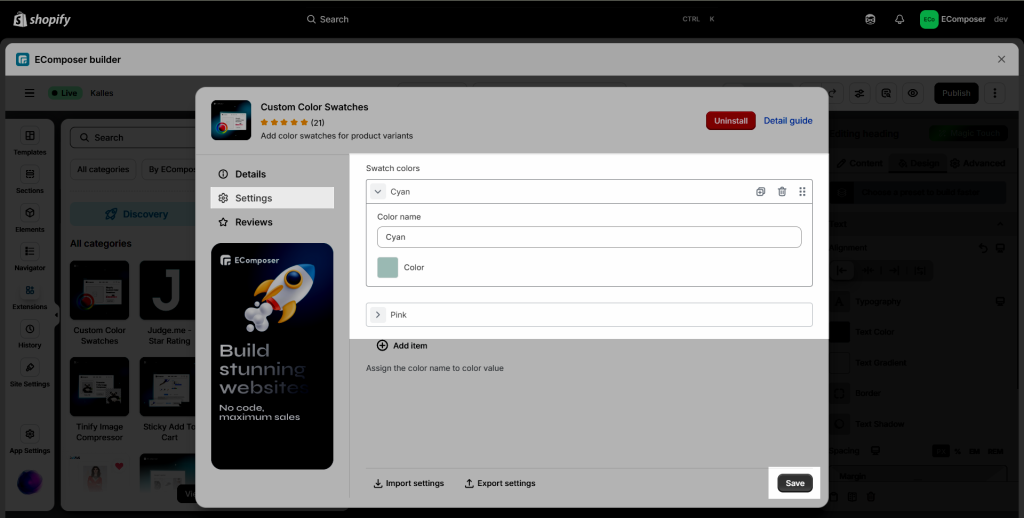 - Now, you open Extension settings -> Settings -> Add item to choose the color that you love and also set a color name for that, you should pick an exact same name as the one you set in Shopify, including uppercase, lowercase, and spaces. One more thing, when you hover to the right side, you can view a Trash Bin icon, so you can delete it there. After done, click Save.